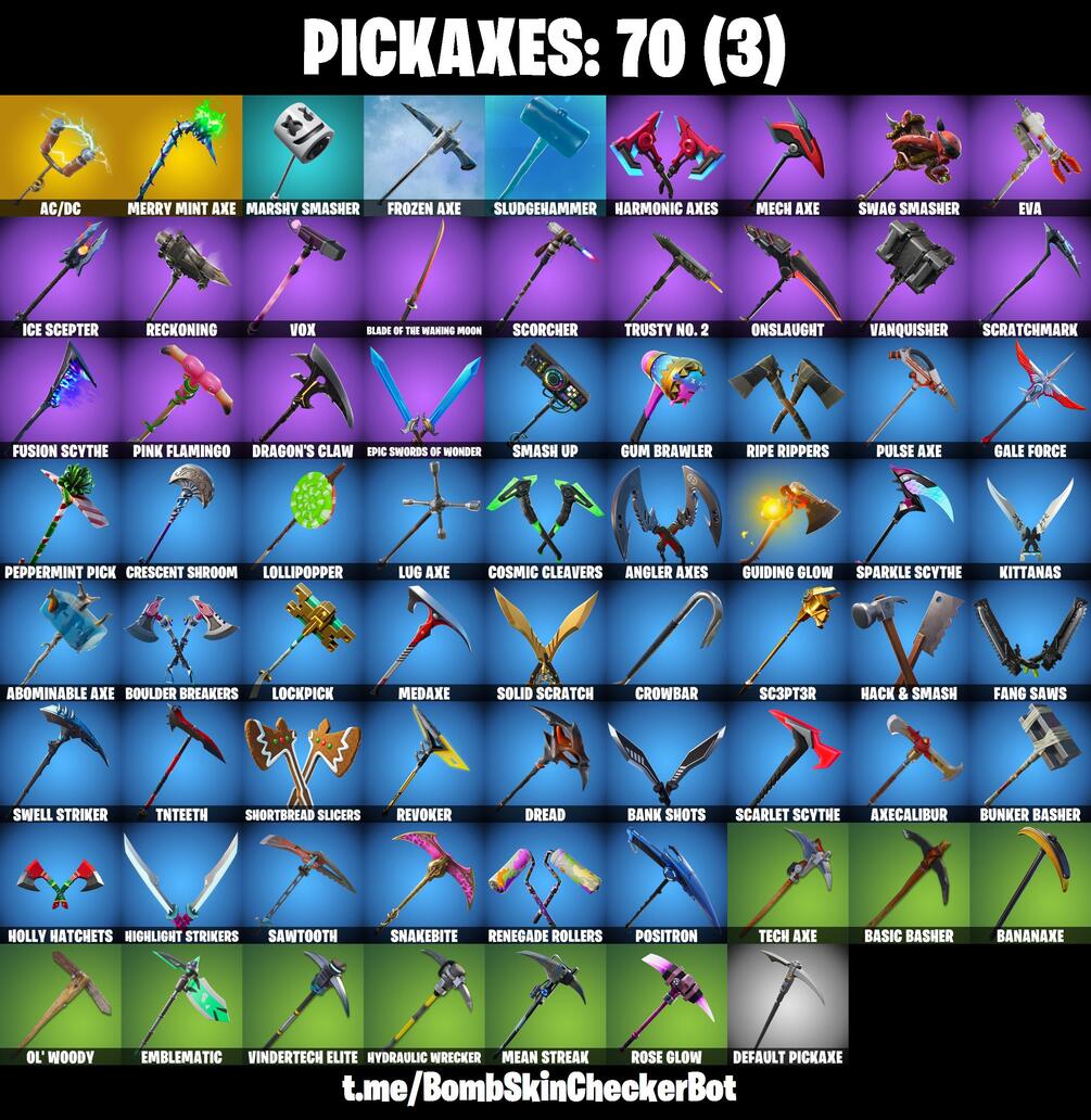Renegade Raider, Black Knight, Merry Mint Axe and Mako Glider • 375 Vbucks • 89 Skins • 70 Pickaxes • 80 Gliders • 94 Emotes